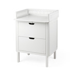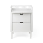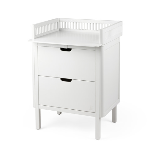 kundeservice@babysam.dkSebra Puslebordet er et elegant, funktionelt og dansk-designet 2-i-1 møbel, som kommer med en kommode, en pusleplade og henholdsvis to skuffer. Puslebordet er designet med et skandinavisk og tidløst udtryk, der harmonerer med de øvrige møbler fra Sebra’s klassiske møbelkollektion. Et funktionelt, sikkert og klassisk puslebord uden uønsket kemi og med lang levetid til børneværelset, soveværelset, badeværelse eller et andet sted i hjemmet. Her ses Sebra Puslebordet med skuffer og i farven Classic White. Sebra Puslebordet med skuffer er et puslebord, der let kan forvandles til et klassisk opbevaringsmøbel, når behovet for puslebordet hører op. Puslepladen er lukket bagtil og til siderne og fremstår med en forhøjet kant med små runde tremmer, som er med til at give puslebordet det karakteristiske udtryk, som Sebra Sengen er så kendt og elsket for. Puslepladen (indvendige mål) har en dybde på 66 cm og en bredde på 69 cm, hvilket giver plads til en puslehynde og andre puslefornødenheder, som kræves i forbindelse med et bleskift, tøjskift eller blot en hyggestund med babypludder. De to skuffer giver mulighed for opbevaring at tøj, bleer, legetøj eller hvad der nu måtte være behov for. Skufferne er udstyret med ”softluk”, som sikrer, at skufferne lukkes stille og roligt. Derved minimeres risikoen for at få fingrene i klemme, og det er en god ting på netop børneværelset, hvor små fingre ikke altid er så hurtige, som de store. Den praktiske forvandling fra puslebord til opbevaringsmøbel sker ved, at puslepladen nemt fjernes fra underdelen. Denne egenskab gør, at det ikke er nødvendigt at opmagasinere et komplet puslebord eller skille sig af med puslebordet i perioden imellem blebørn - eller når behovet for et puslebord blot forsvinder helt. Det giver puslebordet en ekstra lang levetid og et produkt, der kan vokse med barnet eller dets søskende - et møbel, der let kan gå i arv. Fronterne fremstår med udskårne greb, der sammen med kommodens afrundede hjørner er med til at øge sikkerheden på børneværelset – ingen skarpe kanter, som kan give ridser og skrammer. Puslebordet er på fire ben, hvilket sikrer et lettere og mindre bastant udtryk end et puslebord uden ben. Det giver naturligvis også mulighed for opbevaring under kommoden, hvis behovet er der.