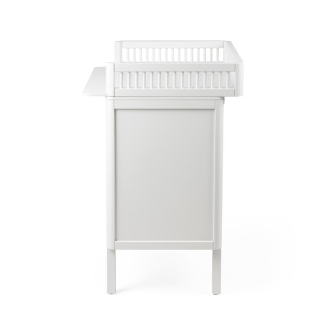 Sebra Puslebordet er et elegant, funktionelt og dansk-designet 2-i-1 møbel, som kommer med en kommode, en pusleplade og henholdsvis to skuffer. Puslebordet er designet med et skandinavisk og tidløst udtryk, der harmonerer med de øvrige møbler fra Sebra’s klassiske møbelkollektion. Et funktionelt, sikkert og klassisk puslebord uden uønsket kemi og med lang levetid til børneværelset, soveværelset, badeværelse eller et andet sted i hjemmet. Her ses Sebra Puslebordet med skuffer og i farven Classic White. Sebra Puslebordet med skuffer er et puslebord, der let kan forvandles til et klassisk opbevaringsmøbel, når behovet for puslebordet hører op. Puslepladen er lukket bagtil og til siderne og fremstår med en forhøjet kant med små runde tremmer, som er med til at give puslebordet det karakteristiske udtryk, som Sebra Sengen er så kendt og elsket for. Puslepladen (indvendige mål) har en dybde på 66 cm og en bredde på 69 cm, hvilket giver plads til en puslehynde og andre puslefornødenheder, som kræves i forbindelse med et bleskift, tøjskift eller blot en hyggestund med babypludder. De to skuffer giver mulighed for opbevaring at tøj, bleer, legetøj eller hvad der nu måtte være behov for. Skufferne er udstyret med ”softluk”, som sikrer, at skufferne lukkes stille og roligt. Derved minimeres risikoen for at få fingrene i klemme, og det er en god ting på netop børneværelset, hvor små fingre ikke altid er så hurtige, som de store. Den praktiske forvandling fra puslebord til opbevaringsmøbel sker ved, at puslepladen nemt fjernes fra underdelen. Denne egenskab gør, at det ikke er nødvendigt at opmagasinere et komplet puslebord eller skille sig af med puslebordet i perioden imellem blebørn - eller når behovet for et puslebord blot forsvinder helt. Det giver puslebordet en ekstra lang levetid og et produkt, der kan vokse med barnet eller dets søskende - et møbel, der let kan gå i arv. Fronterne fremstår med udskårne greb, der sammen med kommodens afrundede hjørner er med til at øge sikkerheden på børneværelset – ingen skarpe kanter, som kan give ridser og skrammer. Puslebordet er på fire ben, hvilket sikrer et lettere og mindre bastant udtryk end et puslebord uden ben. Det giver naturligvis også mulighed for opbevaring under kommoden, hvis behovet er der.