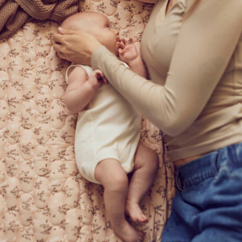 Smukt og praktisk tæppe med smukt print på forsiden og ensfarvet stof på bagsiden. Tæppet har lækkert fyld for at give tæppet en tykkelse der gør at det er behageligt at ligge på når baby ligger og leger på gulvet. Tæppet måler 90x90 cm.