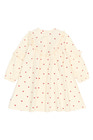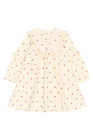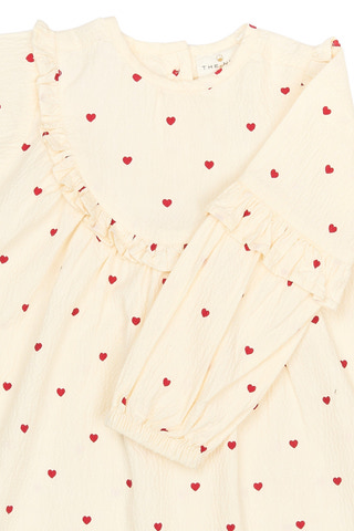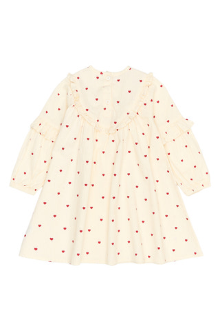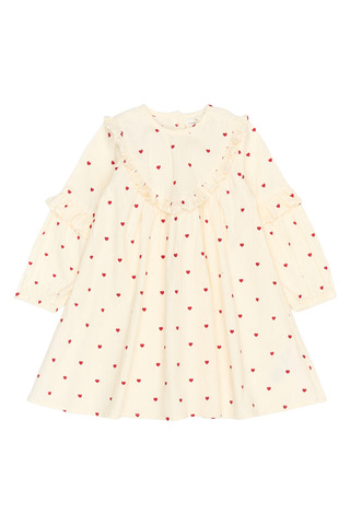 Denne kjole fra THE NEW Siblings er både romantisk og behagelig – perfekt til hyggelige og festlige lejligheder. Den har et sødt all-over hjerteprint og delikate flæsedetaljer langs brystet og ærmerne, hvilket tilføjer et feminint og legende touch. Kjolen har lange ærmer og en let A-form, der giver stor bevægelsesfrihed og en blød silhuet.