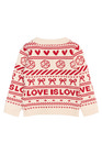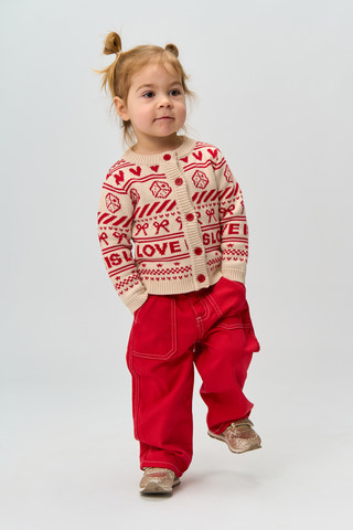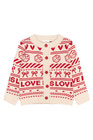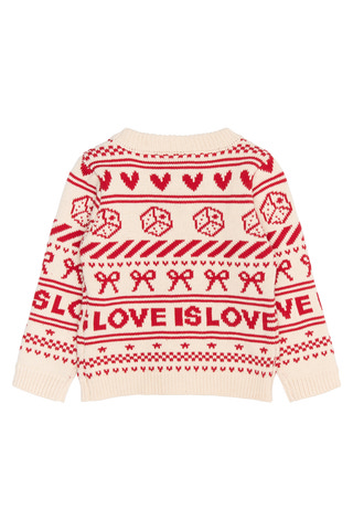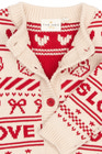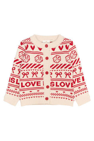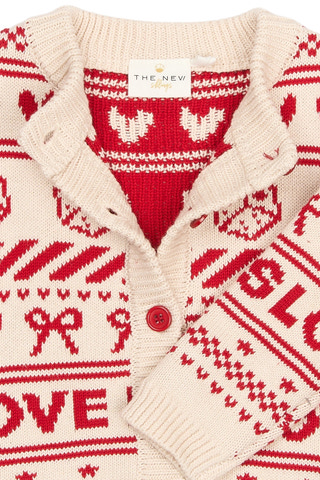 Denne cardigan fra THE NEW Siblings er både hyggelig og festlig – perfekt til sæsonens mange varme og kærlige stunder. Den er strikket med et charmerende jacquardmønster med hjerter, sløjfer, terninger og ordet "LOVE", hvilket skaber et legende og kærligt look. Cardiganen har ribkanter og en knaplukning foran, hvilket gør den nem at tage på og af.