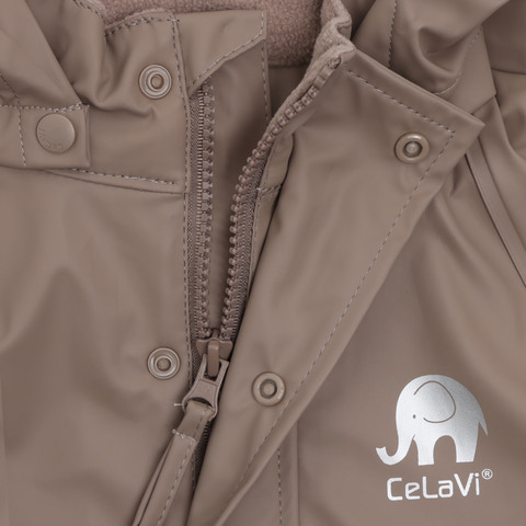 kundeservice@babysam.dkSuper praktisk CeLaVi regn dragt i ensfarvet, slidstærkt PU materiale med den søde CeLaVi elefant på brystet. Dragten er vind- og vandtæt med svejsede sømme, og har et målt vandsøjletryk på 5000 mm. Praktisk elastikkant ved håndled og ankler, samt justerbare elastiske støvlestropper i bunden af benene. Dragten lukkes foran med lynlås og trykknapper. Refleksstribe på højre arm og ben, samt aftagelig hætte med trykknapper.