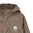Regntøjet er i et slidstærkt materiale der klarer 5000 mm i vandsøjletryk, har tapede sømme og synlige reflekser.