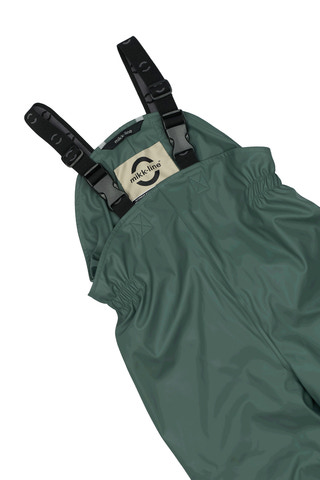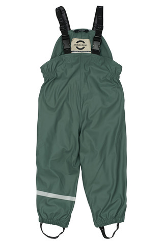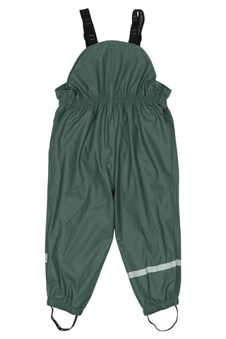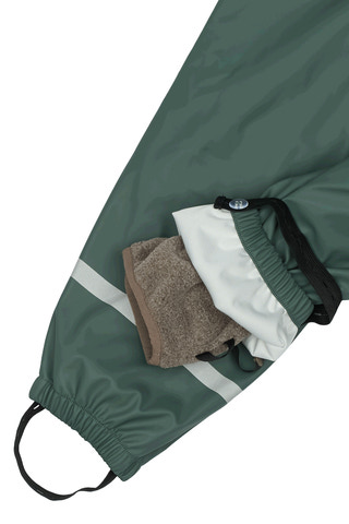Fra str. 74 til 104 har regnbukserne smæk, så de også dækker mave og ryg. Bukserne har også justerbare seler, der lukkes med klikspænder.