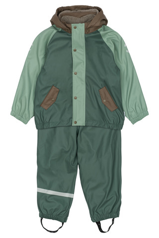 Regntøjet er naturligvis uden skadelige fluorstoffer. Regnsættet har aftageligt blødt fleece foer inde i jakken og i bukserne, så dit barn kan blive ved med at have glæde af sættet, selvom når bliver varmere udenfor.