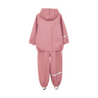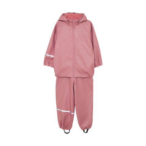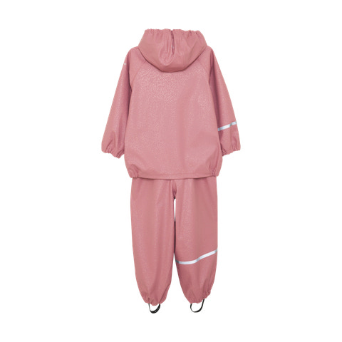Praktisk regntøjsæt i PU fra CeLaVi. Sættet består af en jakke og bukser, i et ensfarvet glitter print. Bukserne har justerbare seler og klikspænder op til str. 110, herefter er de uden seler. Bukserne har praktiske og justerbare elastikstropper, som kan trækkes nedenunder fodtøjet. Jakken lukkes med en vandtæt lynlås. Der er smalle refleksstriber rundt om den ene arm og det ene ben. Øverst på den ene arm og bagpå hætten er logoet refleksprintet. CeLaVi regnjakken har en aftagelig hætte, som fastgøres med trykknapper. Ansigtsåbningen på hætten, ærmerne og taljen har elastik for en bedre pasform.