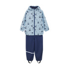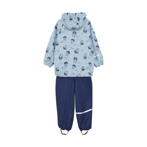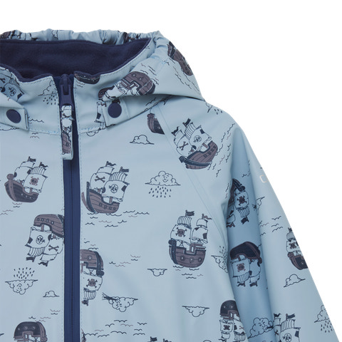kundeservice@babysam.dkPraktisk regntøjssæt i PU fra CeLaVi. Sættet består af en jakke med all-over print og en ensfarvet underdel. Bukserne er med justerbare seler og klik-spænder op til str. 110, herefter er de uden seler. Bukserne har praktiske og justerbare elastikstropper, som kan trækkes nedenunder fodtøjet. Jakken lukkes med en lynlås. Der er smalle refleksstriber rundt om den ene arm og det ene ben. Øverst på den ene arm og bagpå hætten er logoet refleksprintet. CeLaVi regnjakken har en aftagelig hætte, som fastgøres med trykknapper. Ansigtsåbningen på hætten, ærmerne og taljen har elastik for en bedre pasform. Jakken har et vandsøjletryk på 10.000mm