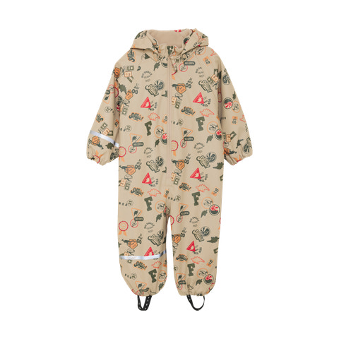 Regndragt i PU fra CeLaVi. Regndragten har et all-over print. Der er smalle refleksstriber rundt om den ene arm og det ene ben. Øverst på den ene arm og bagpå hætten er logoet refleksprintet. CeLaVi regndragten har en aftagelig hætte, som er fastgjort med trykknapper på halskraven. Den lukkes foran med en vandtæt lynlås. Ansigtsåbningen på hætten, ærmerne og taljen har elastik for en bedre pasform. Bukserne har praktiske og justerbare elastikstropper, som kan trækkes nedenunder fodtøjet.