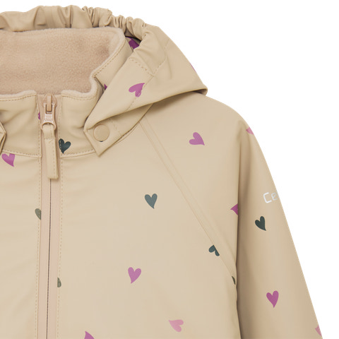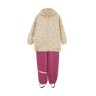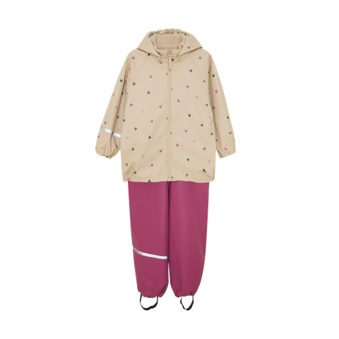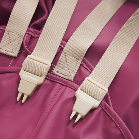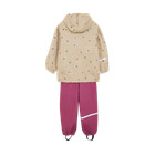 Praktisk regntøjsæt i PU fra CeLaVi. Sættet består af en jakke med all-over print og en ensfarvet underdel. Bukserne er med justerbare seler og klik-spænder op til str. 110, herefter er de uden seler. Bukserne har praktiske og justerbare elastikstropper, som kan trækkes nedenunder fodtøjet. Jakken lukkes med en vandtæt lynlås. Der er smalle refleksstriber rundt om den ene arm og det ene ben. Øverst på den ene arm og bagpå hætten er logoet refleksprintet. CeLaVi regnjakken har en aftagelig hætte, som fastgøres med trykknapper. Ansigtsåbningen på hætten, ærmerne og taljen har elastik for en bedre pasform. Certificeret i hht. GRS - Made with 66% Recycled