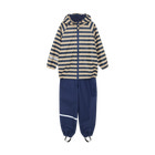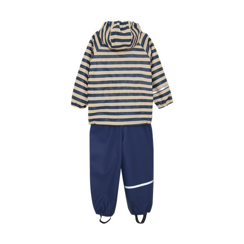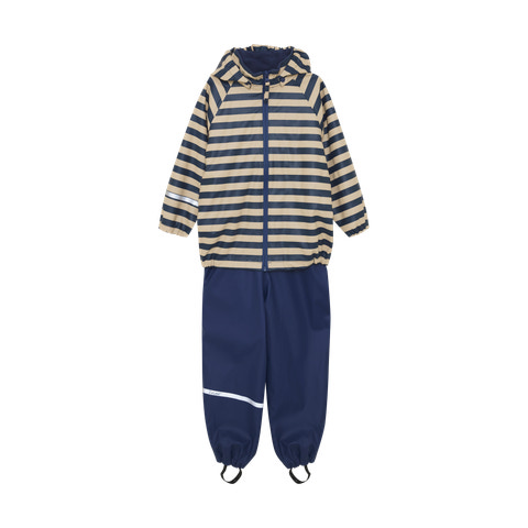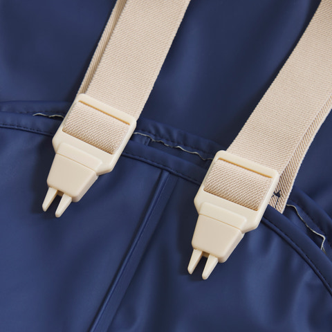 Praktisk regntøjssæt i PU fra CeLaVi. Sættet består af en jakke med all-over print og en ensfarvet underdel. Bukserne er med justerbare seler og klik-spænder op til str. 110, herefter er de uden seler. Bukserne har praktiske og justerbare elastikstropper, som kan trækkes nedenunder fodtøjet. Jakken lukkes med en lynlås. Der er smalle refleksstriber rundt om den ene arm og det ene ben. Øverst på den ene arm og bagpå hætten er logoet refleksprintet. CeLaVi regnjakken har en aftagelig hætte, som fastgøres med trykknapper. Ansigtsåbningen på hætten, ærmerne og taljen har elastik for en bedre pasform. Jakken har et vandsøjletryk på 10.000mm