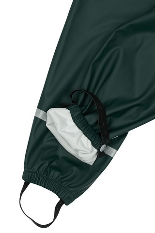 Praktisk og funktionelt recycled regnsæt fra mikk-line, der holder dit barn tørt. Regntøjet er udstyret med refleksdetaljer så dit barn kan færdes sikkert i mørket. Regnsættet er naturligvis både vand- og vindtæt. Sømmene er svejsede, hvilket forhindrer vand i at trænge igennem samlingerne. Buksen har fodstropper, som holder buksen under gummistøvlen. Regnbukserne har justerbare seler, tætsiddende elastik i taljen og et ekstra stykke stof der dækker både foran og bagpå kroppen.
