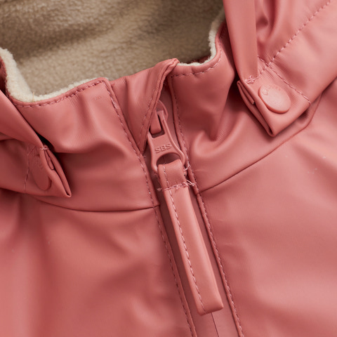 Den åbnes foran med en vandtæt lynlås, som er beskyttet af en dobbelt vindstolpe. En blød hagebeskytter sikrer, at lynlåsen ikke generer under hagen. Flyverdragten har en varm foring og en aftagelig hætte, som giver fleksibilitet i skiftende vejr.