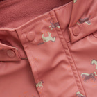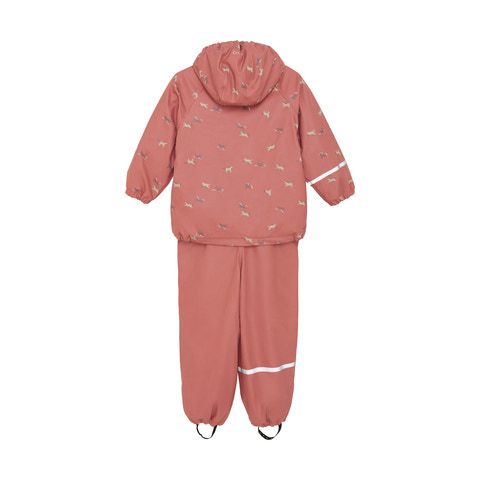 Sættet består af en regnjakke med all-over print og ensfarvede regnbukser.