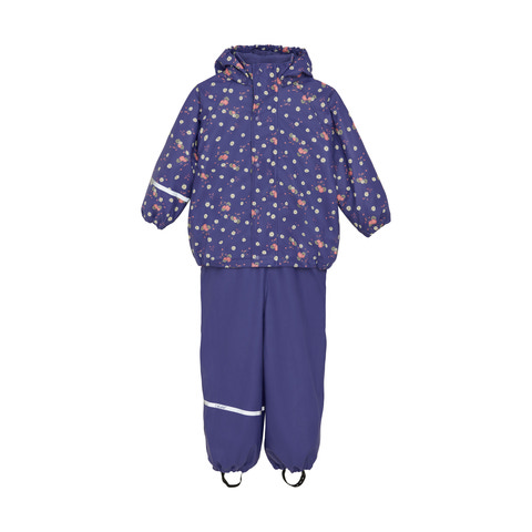 Sættet består af en regnjakke med all-over print og ensfarvede regnbukser.