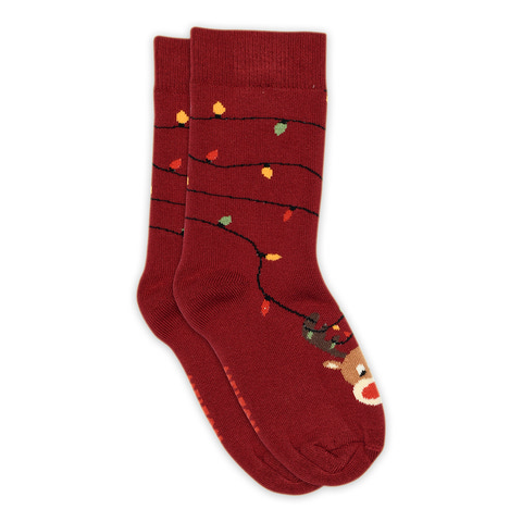 Strømper i bomuld fra MELTON. Strømperne har indvendig frotté og er dekoreret med et kulørte lamper og søde rensdyr.