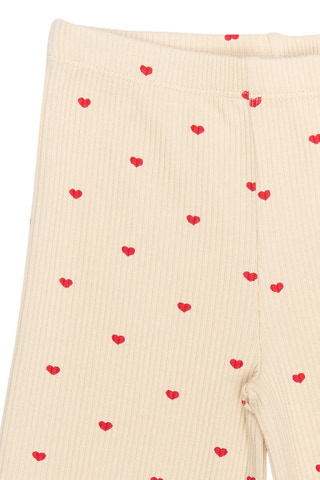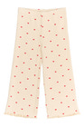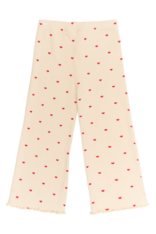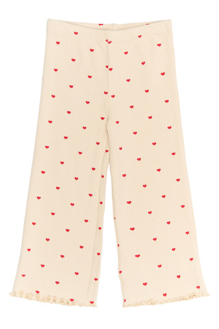 Disse brede ribbukser fra THE NEW Siblings er både legende og behagelige – ideelle til hverdagsbrug med et stilfuldt twist. Med et charmerende hjerteprint og feminine salatkanter ved anklerne tilbyder de en blød og fleksibel pasform med en elastisk linning. Sæt dem sammen med den matchende TNSTRhea Rib Tee for et komplet og koordineret look.