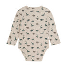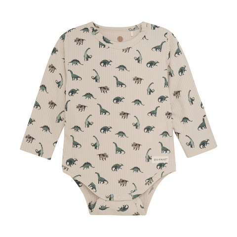 Body fra EN FANT med sejt all-over dinosaurprint. Denne body er lavet i en blød bomuldsblanding, der føles behagelig og skånsom mod huden. Den har lange ærmer, en klassisk rund halsudskæring og praktisk lukning med trykknapper mellem benene, som gør den nem at tage af og på.