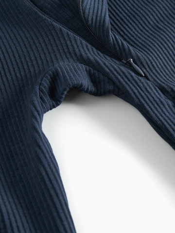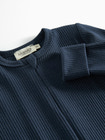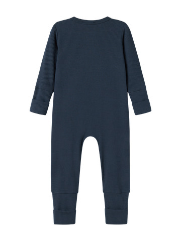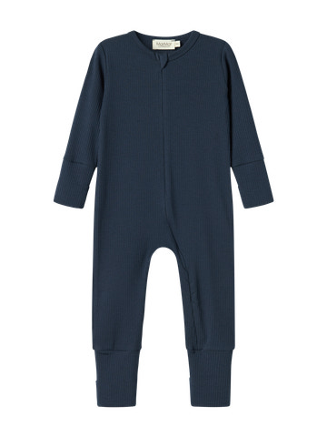 Enkel langærmet heldragt der kan lynes helt fra hals og ned langs det ene ben med lynlås for nem bleskiftning. Heldragten har ombuk ved både ærmer og ben, som kan justeres i takt med barnets væks. Heldragten har ydermere foldbar vante/strømpe funktion fra str. 2-4M. Ribstrikket med elastan