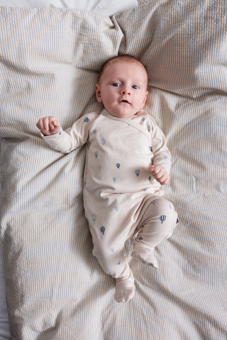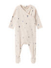 Langærmet heldragt med fødder til de mindste. Heldragten har slå-om-lukning og lukkes med trykknapper fra halsen og ned langs det ene ben. Jersey med elastan