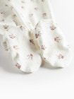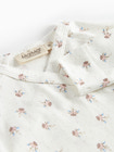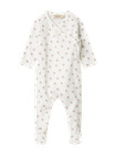 Langærmet heldragt med fødder til de mindste. Heldragten har slå-om-lukning og lukkes med trykknapper og bindebånd fra halsen og ned langs det ene ben. Jersey med elastan