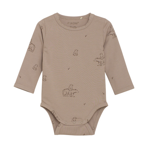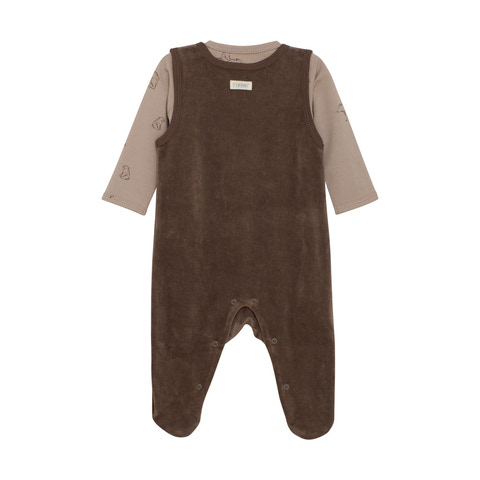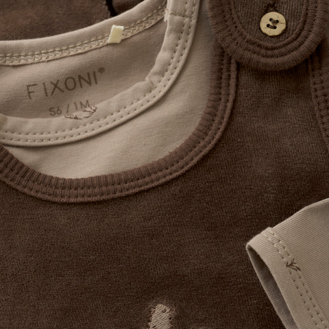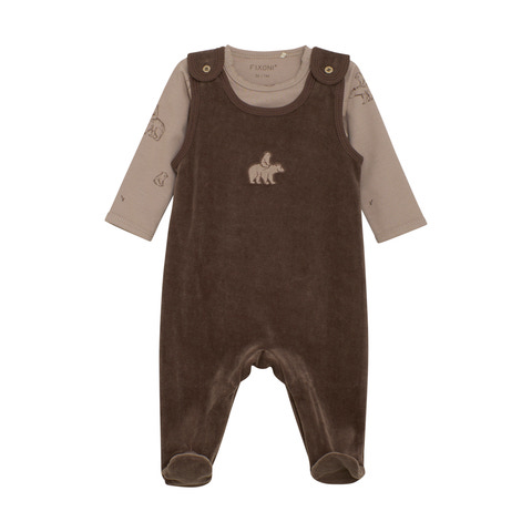 Sødt sæt fra FIXONI bestående af body og romper. Bodyen har et fint all-over-print og lukkes nemt med trykknapper ved skulderen og mellem benene. Den ensfarvede romper er lavet i blød velour med fødder og har trykknapper mellem benene for nem påklædning og bleskift.