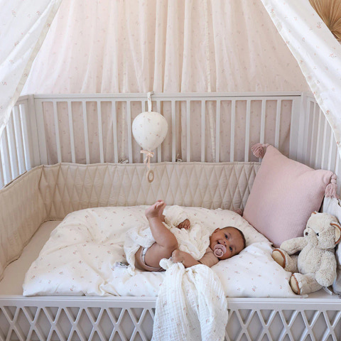En blød og økologisk sengerand med et fyldigt indre, der skaber komfort, ro og tryghed omkring dit barn under søvnen. Sengeranden fås i smukke farver og er dekoreret med Cam Cams karakteristiske Harlekin-broderi - opkaldt efter det ikoniske rombemønster, kendt fra den klassiske Pierrot La Lune‑ballet. Den kan let overlappes, hvis længden er en smule for stor til sengen.