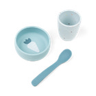 Det praktiske spisesæt i silikone består af en kop, en skål og en ske og har den perfekte størrelse til at de små hænder kan gå på opdagelse i madens verden. Silikone er varmebestandigt og derfor velegnet til brug i mikrobølgeovn, ovn og fryser. Sættet er anti-slip og easy-grip og med skålens runde sider bliver det nemt for barnet at få maden op på skeen.