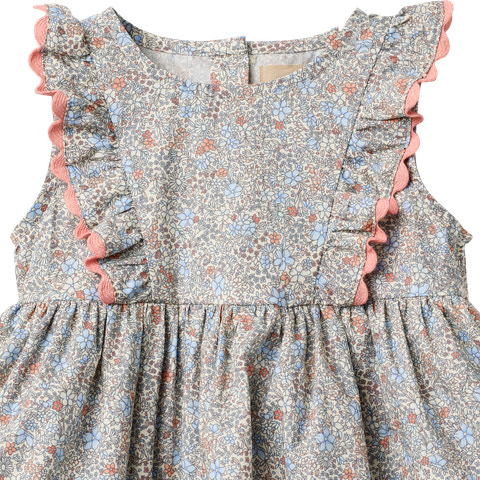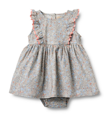 Sofia Bodykjole - Air Blue Flowers fra Wheat er en skøn og praktisk bodykjole, der kombinerer komfort med et charmerende design. Kjolen er fremstillet i 100% økologisk bomuld, hvilket gør den ekstra blød og behagelig for dit barn at have på – perfekt til både hverdag og festlige lejligheder. Det fine blomsterprint i lyseblå og rosa nuancer giver et sødt og sommerligt udtryk, mens de dekorative flæser langs skuldrene tilføjer et feminint touch. Bodykjolen har indbygget body med trykknapper mellem benene, hvilket gør det nemt at skifte ble og klæde barnet på. Den lette og luftige kvalitet sikrer, at dit barn kan bevæge sig frit og komfortabelt hele dagen. Sofia Bodykjole er ideel til varme dage, men kan også styles med strømpebukser og en cardigan, når vejret er køligere. Wheat er kendt for deres fokus på bæredygtighed og komfort, og denne kjole er ingen undtagelse – den er både miljøvenlig og skånsom mod barnets hud. Med Sofia Bodykjole får du et alsidigt og smukt stykke tøj, der hurtigt bliver en favorit i garderoben.