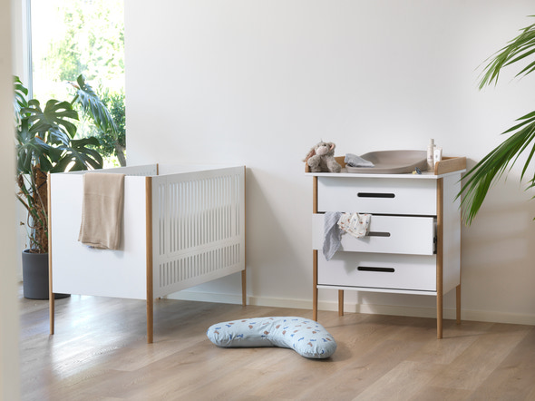 Den store pusleplade monteres ovenpå kommoden – helt uden at lave huller – og kan nemt fjernes igen, når pusletiden er ovre. Dermed får du en stilfuld kommode, der kan bruges til opbevaring af tøj, legetøj eller andet. Spoke skaber en tryg og praktisk ramme om barnets første år og tilføjer karakter til børneværelset.