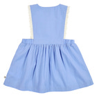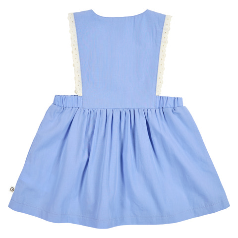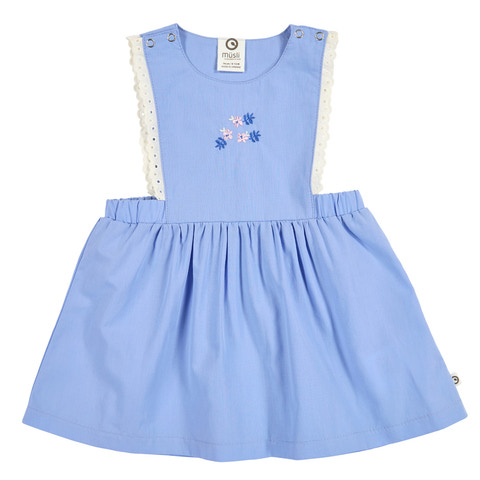 Spring Pinafore Kjole fra Müsli er en yndig og komfortabel kjole, der er perfekt til forårets og sommerens mange hyggelige stunder. Kjolen er lavet i blød bomuld, som føles behagelig mod huden og giver god bevægelighed til leg og aktivitet. Den flotte shell blue farve kombineret med de fine broderede blomster på brystet og de dekorative blonder langs stropperne giver kjolen et sødt og klassisk udtryk. Kjolen har praktiske trykknapper på skuldrene, som gør det nemt at tage den af og på, og den elastiske talje sikrer en god pasform. Perfekt til både hverdag og festlige lejligheder, hvor komfort og stil går hånd i hånd. Müsli er kendt for deres fokus på kvalitet og bæredygtighed, så du kan trygt vælge denne kjole til dit barn.