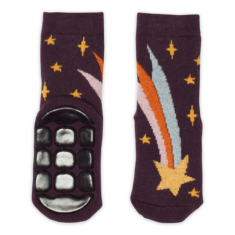 Anti-slip strømper i bomuld fra MELTON. Strømperne har indvendig frotté og er dekoreret med et glitrende stjerneskud og flotte stjerner. Strømperne har skridsikre knopper under sålen.