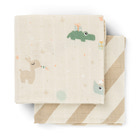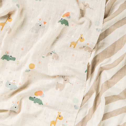 Stofble 2 stk. Celebration Sand fra Done By Deer er et must-have til alle småbørnsfamilier. Disse stofbleer er lavet i blødt og åndbart materiale, der føles behageligt mod barnets hud. De kommer i et sæt med to styk, begge i smukke nuancer med festlige og legende motiver, der gør dem ekstra hyggelige at bruge. Stofbleerne er alsidige og kan bruges til alt fra pusletid, amning, som nusseklud eller til at tørre små hænder og ansigter. De leveres med et dekorativt gavebånd, hvilket gør dem oplagte som en sød gave til babyshower eller barselsbesøg.