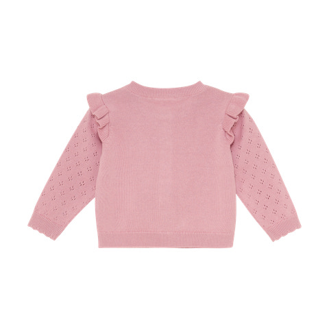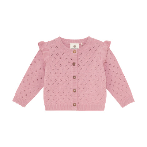 Denne strikkede cardigan fra En Fant er et skønt valg til garderoben, når der skal lidt ekstra varme og stil på. Cardiganen har et yndigt hulmønster og fine flæser ved skuldrene, som giver et feminint og elegant udtryk. Den bløde strik sikrer komfort hele dagen, og den klassiske knaplukning gør det nemt at tage cardiganen af og på. Ribkanter ved ærmer og bund sørger for en god pasform, mens den runde hals gør den let at kombinere med både kjoler og bluser. Perfekt til både hverdag og festlige lejligheder, hvor dit barn skal være både smart og komfortabel.
