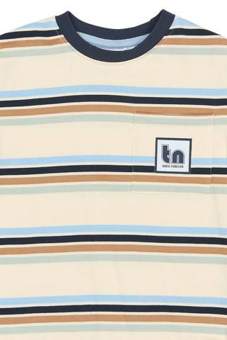 Stuart T-Shirt fra The New Siblings er et skønt valg til hverdagsgarderoben, hvor komfort og stil går hånd i hånd. T-shirten er lavet af 100% økologisk bomuld, hvilket gør den ekstra blød og behagelig mod barnets hud – perfekt til både leg og afslapning. Det klassiske stribede mønster i gardenia, blå og brune nuancer giver et tidløst look, der nemt kan matches med både shorts, jeans eller nederdel. Den mørkeblå ribkant i halsen tilføjer et flot kontrast og sikrer, at t-shirten holder formen vask efter vask. På brystet finder du en lille lomme med et diskret tn-logo, som giver et moderne og legende udtryk. T-shirten har en afslappet pasform, der giver god bevægelsesfrihed, så barnet kan udfolde sig frit hele dagen. Med fokus på både kvalitet og bæredygtighed er Stuart T-Shirt et sikkert hit til enhver børnegarderobe.
