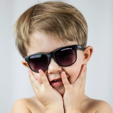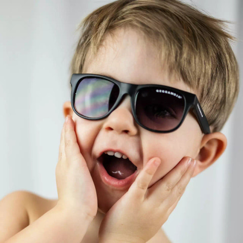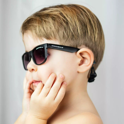 Bløde, fleksible solbriller til babyer i silikone. Elastikbåndet sættes rundt om hovedet, så de sidder på plads. Elastikbåndet kan tages af ved hjælp af spænder i enderne af brillestængerne og kan justeres for at sikre en perfekt pasform.