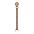 Praktisk suttesnor i fint stribet stof. Sutte-snoren har en metalklips med træ ovenpå så man kan påsætte snoren på trøjen så sutten ikke bliver væk. På enden af sutte-snoren sidder der en gummiring som kan holde på flere forskellige slags sutter. Mål 2x20 cm.
