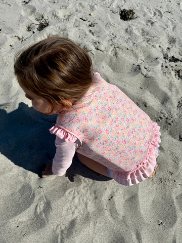 Svømmevesten med strop fra Vanilla COPENHAGEN i farven English Rose er både praktisk og charmerende til de mindste vandhunde. Med det smukke Liberty Beach-blomstermønster og fine flæsedetaljer får dit barn en vest, der både er sikker og ser skøn ud. Den justerbare strop mellem benene sikrer, at vesten bliver siddende korrekt, selv når barnet leger og bevæger sig i vandet. Lynlåsen foran gør det nemt for både børn og voksne at tage vesten af og på, og den bløde pasform giver god bevægelsesfrihed. Svømmevesten er ideel til strandture, pool eller svømmehal, hvor barnet skal have lidt ekstra opdrift og tryghed. Husk, at svømmevesten ikke er en redningsvest og altid skal bruges under opsyn af en voksen. Med Vanilla COPENHAGEN får du en vest, der kombinerer sikkerhed, komfort og et flot design, så dit barn kan nyde vandet med stil og tryghed.