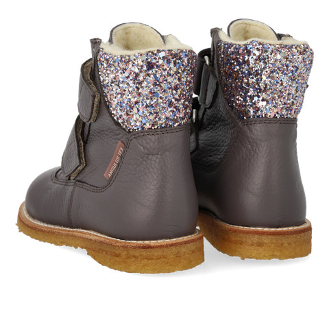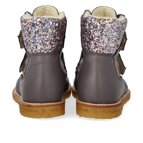 Vandafvisende TEX-vinterstøvle i læder med funklende glitterdetalje bag på.
