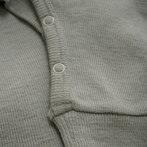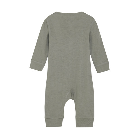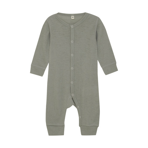 Dragten har trykknapper foran og ned langs benene, så den er nem at få af og på. Ulden hjælper naturligt med at regulere temperaturen og lede fugt væk, så dit barn holdes lunt og tørt hele dagen.