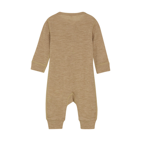Dragten har trykknapper foran og ned langs benene, så den er nem at få af og på. Ulden hjælper naturligt med at regulere temperaturen og lede fugt væk, så dit barn holdes lunt og tørt hele dagen.