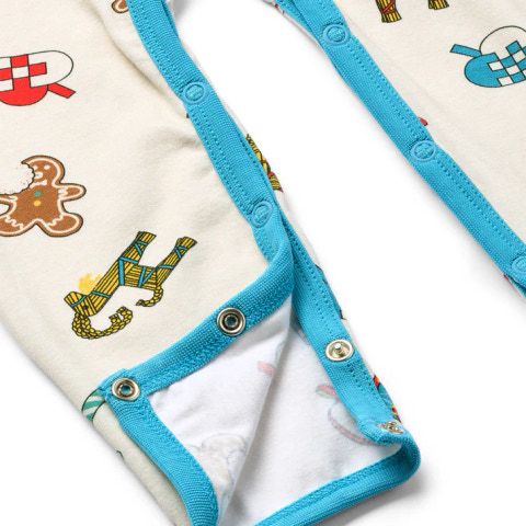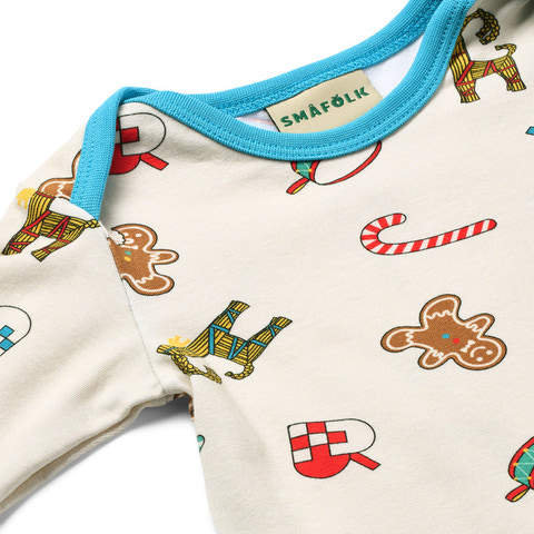 Dette dejlige juleprint har noget for enhver smag. Printet er en fejring af sæsonen og viser nogle danske juletraditioner såsom de håndfoldede julehjerter, trommen, julegeden lavet af hø og de søde slik julestokke. Småfolks print er tegnet med fokus på glade farver, detaljer og historier. Vores heldragter til babyer er en god måde at tilføje personlighed til dit barns garderobe, samtidig med at dit barn kan føle sig komfortabel hele dagen.
