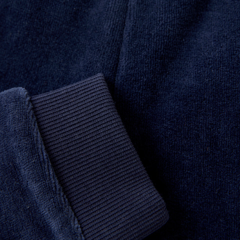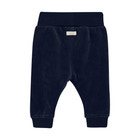 Bløde velourbukser fra FIXONI. Bukserne har en bred ribkant i taljen og ved benåbningerne, som kan foldes for ekstra komfort og fleksibilitet. De er lavet i en blød velourkvalitet, der føles behagelig mod barnets hud.
