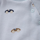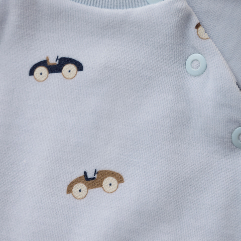 Romper i blød velour med all-over-print fra FIXONI. Denne romper har en praktisk åbning med trykknapper foran ved halsen og mellem benene, hvilket gør den nem at tage af og på – ideel til både leg og hvile.
