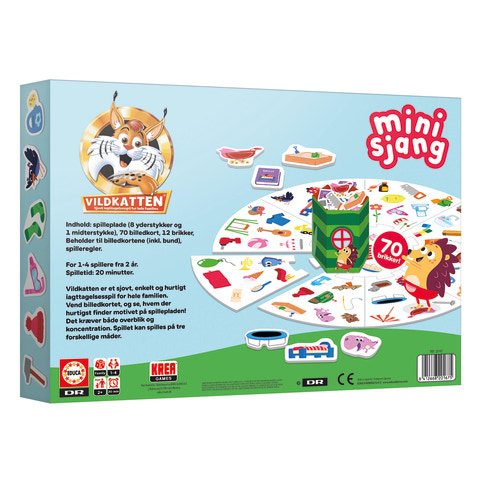 Vildkatten Minisjang Børste er et sjovt og lærerigt spil med fokus på både leg og sproglig udvikling. Brikkerne er inddelt i 12 kategorier, så du kan træne barnets evne til at sætte ord i sammenhæng. Kategorierne er; Tøj, legetøj, værktøj, sovetid, hos lægen, på stranden, mad, på børneværelset, på legepladsen, musikinstrumenter, i haven og fødselsdag. Sprogudvikling trænes også gennem leg – og mens I spiller. Med fire enkle tips kan barnets ordforråd og samtalefærdigheder styrkes: ’Sæt ord på det I ser’, ’Stil nysgerrige spørgsmål’, ’Bred emnet ud’ og ’Forbind ordene til hverdagen’. Spillet gør det nemt og sjovt at lære gennem dialog og fælles oplevelser.
