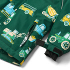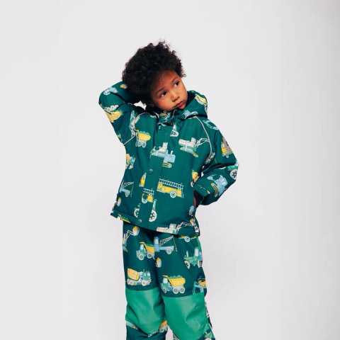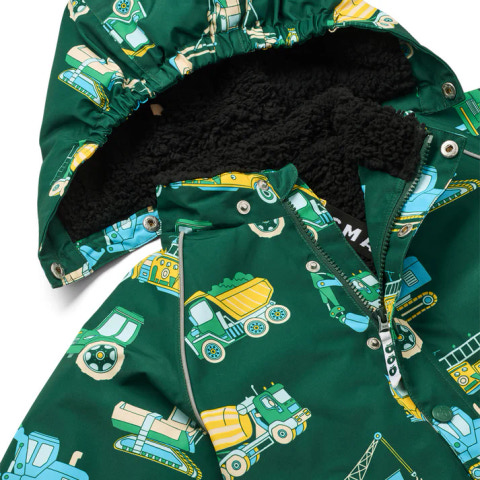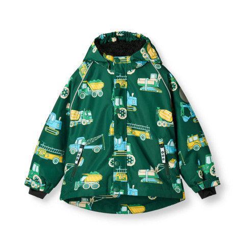 Vinterjakke med køretøjer. Jakken har en lynlås foran og en aftagelig hætte med teddy fleece. Jakken har seler samt justerbar vindfang i bunden af jakken, samt vindfang og velcrolukning ved håndleddene der også kan justeres. Vinterjakken har refleks piping ved armene.