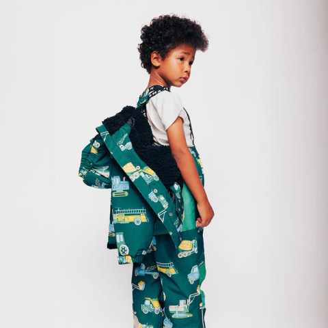 kundeservice@babysam.dkVinterjakke med køretøjer. Jakken har en lynlås foran og en aftagelig hætte med teddy fleece. Jakken har seler samt justerbar vindfang i bunden af jakken, samt vindfang og velcrolukning ved håndleddene der også kan justeres. Vinterjakken har refleks piping ved armene.