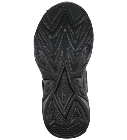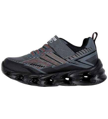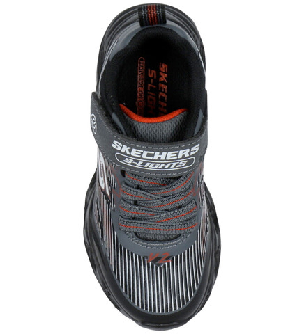 Smarte Skechers-skor i svart och mörkgrått med smala ränder i vitt och rött och ett logotryck på utsidan samt på kardborrebandet. Skorna har inbyggd LED-ljud i yttersulorna som aktiveras när barnet går och springer. Ljuset kan tändas och släckas med en knapp på kardborrebandet.