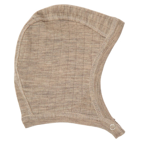 Lækker og åndbar babyhat, perfekt til luren i barnevognen.  Denne uldhue er perfekt til luren i barnevognen da den er tynd og let og giver en behagelig varme uden at barnet får det for varmt.  Huen lukkes med et bånd med en påsat tryklås.  Huen har 2 størrelsesmuligheder og kan derfor bruges over længere tid i takt med at barnets hoved vokser.  Uld er varmeregulerende og har den evne at den holder tør og varm da uld transporterer sved væk fra kroppen.   Denne hue er fremstillet fra str. 44-74 og passer derfor til meget små babyer.  Produktet er Naturetexx® Plasma- og GOTS Organic-certificeret, hvilket betyder: - Ingen skadelige kemikalier  - Ingen superwash  - Ingen mulesing eller sheep dip - Ingen grusom dyretransport   Vaskevejledning: Uld skal ikke vaskes så ofte som andet tøj, da det er et selvrensende materiale, der sjældent kommer til at lugte. Men når der nu er tale om børnetøj er vask alligevel uundgåeligt. Alle vores uld-produkter kan vaskes ved 30 grader på uld-program og med lav centrifugering.  Benyt et vaskemiddel beregnet til uld, da almindeligt vaskemiddel indeholder enzymer som nedbryder ulden og dens kvaliteter.  Kan stryges eller dampes ved lav temperatur.  (GOTS Organic  Certified by Ecocert Greenlife Lic. No. 152033). Produktet er GOTS organic- certificeret, hvilket betyder at bomulden er certificeret økologisk, og at der i alle andre processer som farvning, strikning og syning er taget de strengeste hensyn til miljøet. GOTS er internationalt anerkendt som den førende standard for forarbejdning af tekstiler af økologisk bomuld. Derudover tages der også hensyn til arbejdsforholdene, hos dem der producerer tøjet. Økologisk uld 100%