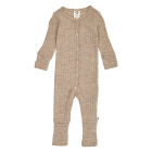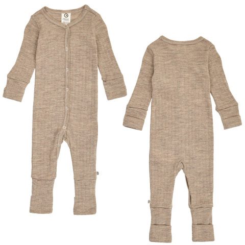 Skøn heldragt i blød merinould rib kvalitet.  Heldragten lukkes fortil med tryklåse og har vendbare fødder og hænder.  Dragten er perfekt til de små for at sikre at de ligger lunt og trygt.  De vendbare fødder og hænder kan foldes efter behov.  Denne heldragt er fremstillet fra str. 44-74 og passer derfor til meget små babyer.  Fremstillet i blød 100 % merinould-rib (GOTS Organic  Certified by Ecocert Greenlife Lic. No. 152033). Produktet er GOTS organic- certificeret, hvilket betyder at bomulden er certificeret økologisk, og at der i alle andre processer som farvning, strikning og syning er taget de strengeste hensyn til miljøet. GOTS er internationalt anerkendt som den førende standard for forarbejdning af tekstiler af økologisk bomuld. Derudover tages der også hensyn til arbejdsforholdene, hos dem der producerer tøjet. Økologisk uld 100%
