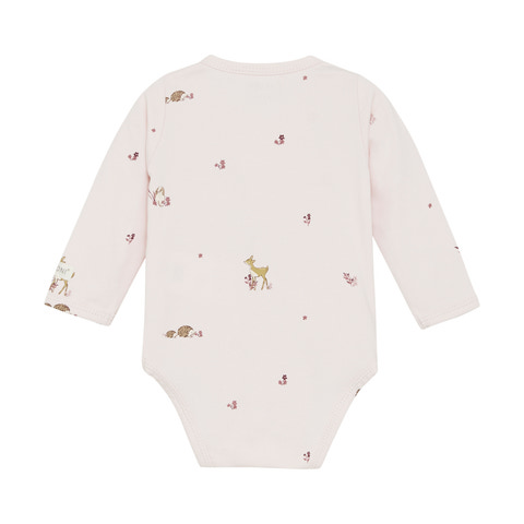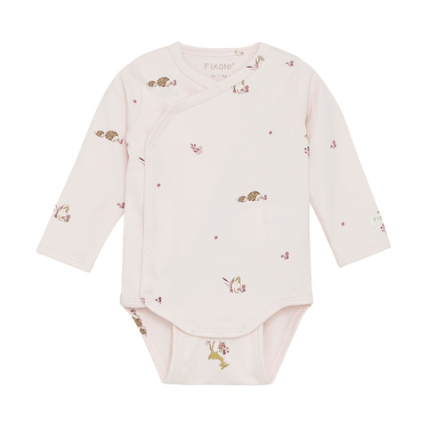 Langærmet slå-om-body med all-over-print fra FIXONI. Bodyen åbnes nemt med trykknapper foran og mellem benene, hvilket gør den praktisk ved både påklædning og bleskift.